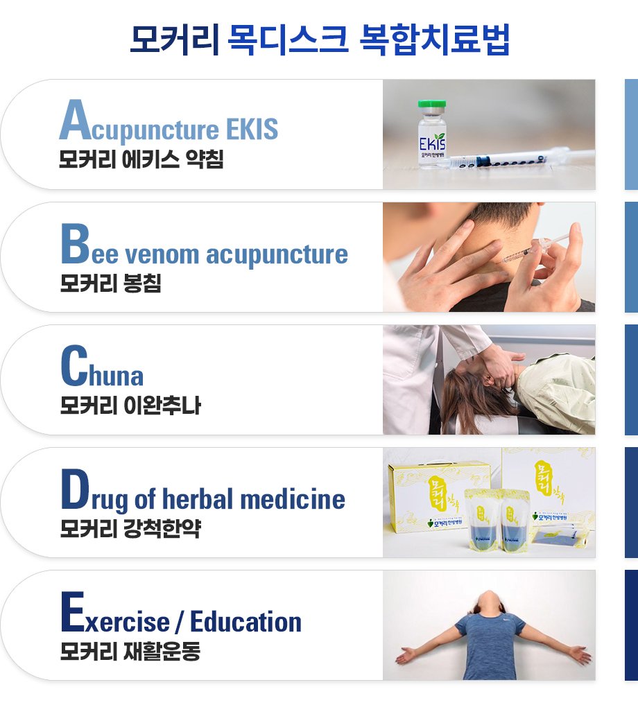 모커리 목디스크 한•양방 협진 근육 재활치료법 수술 없이 목디스크를 치료하는 모커리만의 고유의 비수술 치료방법입니다. 초기 목디스크는 물론 수술을 권유 받을 정도의 힘 빠짐이나 마비를 동반한 중증 목디스크까지 한•양방 협진 근육 재활치료법 목디스크 비수술 치료법으로 치료할 수 있습니다. 모커리는 미국통증학회(AAPM) 등 국제학술발표를 통하여 목디스크가 허리디스크보다 훨씬 더 쉽고 빠르게 치료 가능하다는 것을 과학적으로 검증했으며 또 한•양방 협진 근육 재활치료법에 대한 치료 효과를 객관적으로 입증했습니다.
