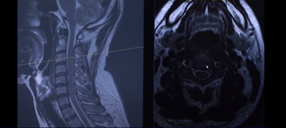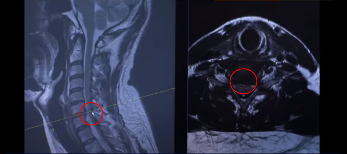 여기 MRI를 보시면 이렇게 세 마디에 퇴행성 목디스크가 있습니다. 보시다시피 희미하게 밀려서 올라간 게 보이실 겁니다. 디스크가 밀려서 올라간 겁니다.