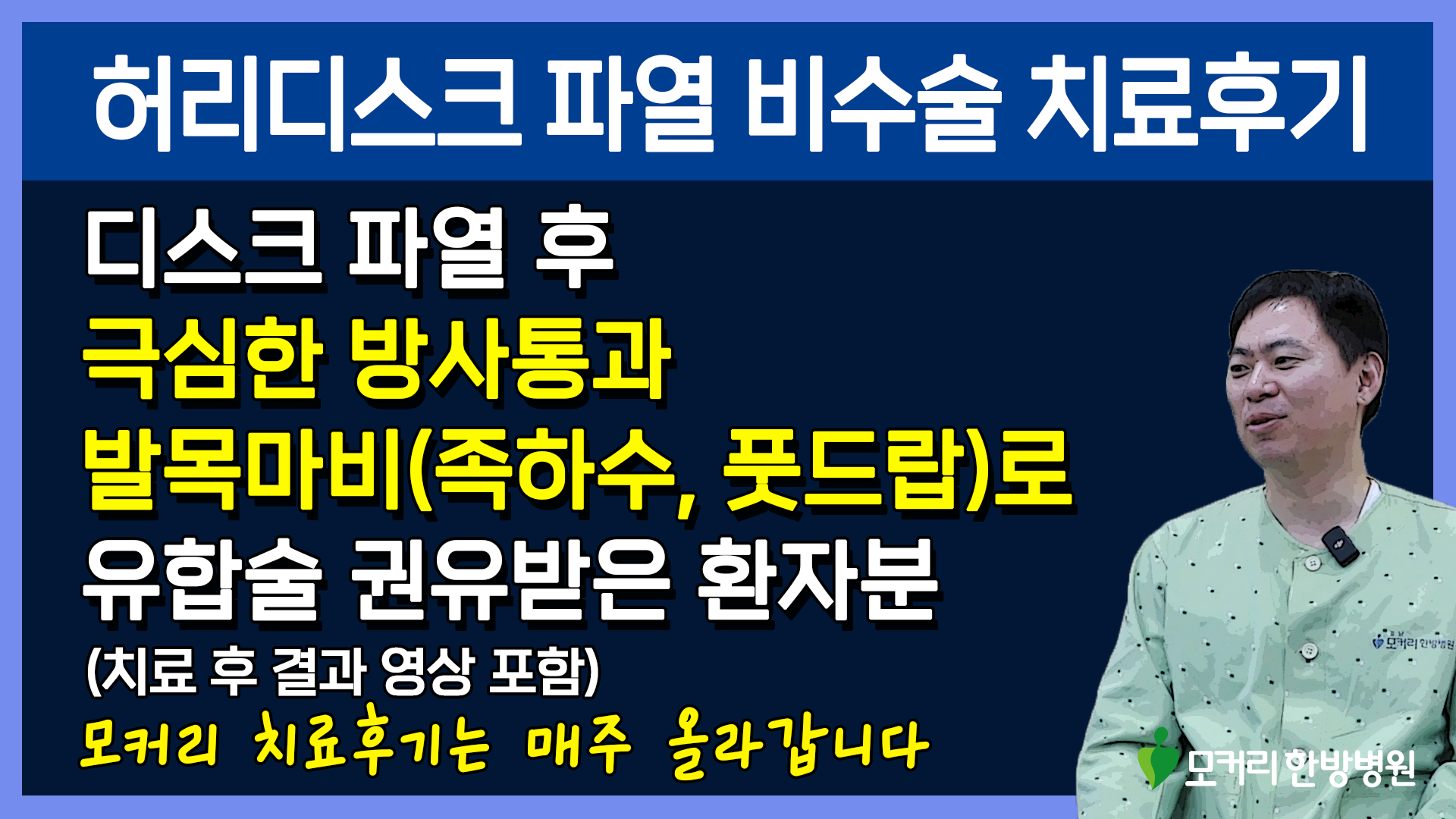 유튜브 알고리즘으로 모커리한방병원이 나왔는데 여기 환자분들이 직접 병원에서 입원해서 치료 받으면서 좋아진 사례를 말씀하시잖아요. 환자분들이 직접 인터뷰 하는 게 되게 신뢰가 많이 가더라고요. 수술은 하기 싫고 치료는 하긴 해야 되는데 그래서 여기 모커리를 한번 찾아와 가지고 원장님을 뵀어요.