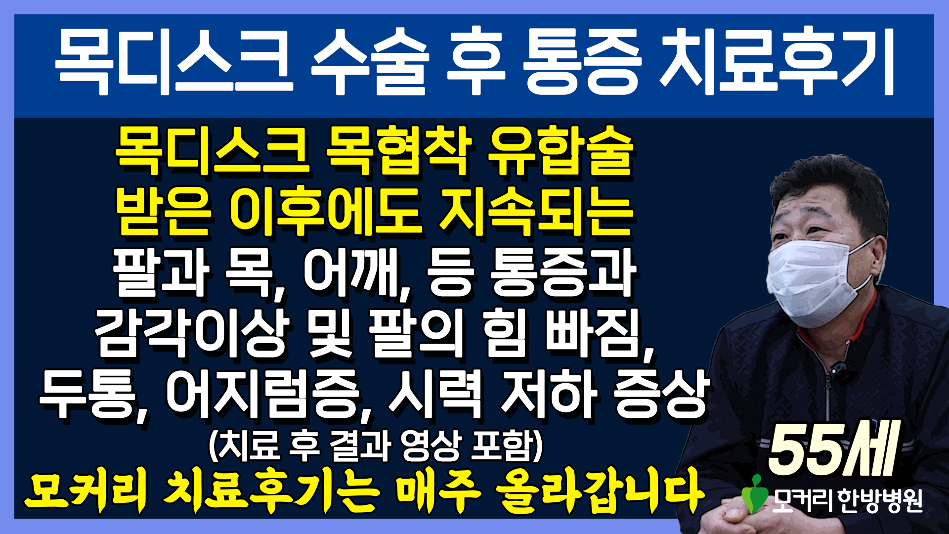 MRI상으로는 목디스크, 협착이 같이 있는 전반적으로 안 좋은 데가 많이 있는 상황이었거든요. 통증이 팔, 어깨, 등쪽, 목, 그 다음에 허리까지 다리도 다 저리고 시리고 또 감각 이상 목, 어깨 통증 전신에 통증이 다 있었는데 병원에서 수술 권유를 하더라고요. 제 생각에도 통증이 지긋지긋하니까 그래서 목 4, 5번 한마디만 유합술 했거든요. 강남 OOO병원에서 23년도에 유합술 받았습니다.