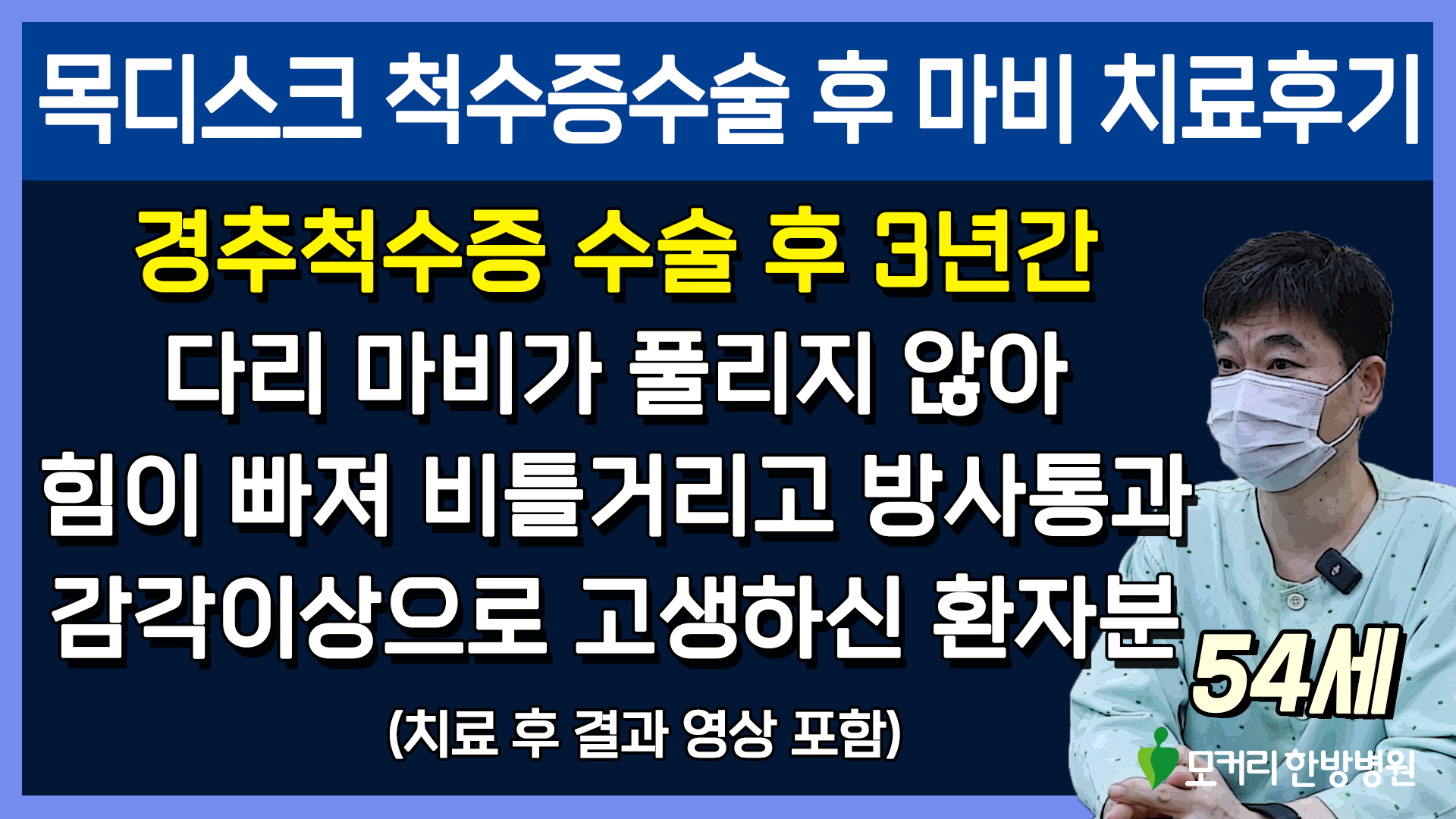 수술은 잘 돼서 신경 눌림은 잘 풀렸다고 했지만 양쪽 다리 힘이 빠지고 비틀거리고 10m도 걷지 못하는 증상은 좋아진 게 거의 없습니다. 수술 후에도 양쪽 다리 감각이상, 특히 시린 증상과 화끈거림 그리고 통증도 심했고 감각기능도 많이 떨어진 상태 그대로였습니다. 수술 후 3년간 호전되지 않는 이런 증상들 때문에 양방치료, 한방치료 등 많은 치료를 여러 병원에서 받아봤지만 본인 표현으로는 조금도 좋아지지 않았다고 합니다.