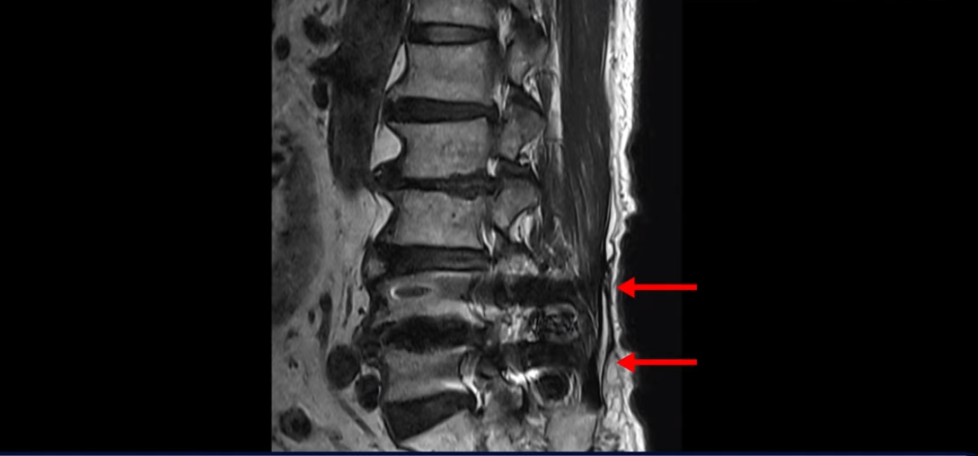 이분 허리 MRI를 보면서 간단히 설명드린 후 유합술 이후 인접마디에 문제가 생긴 환자분들이 왜 추가적인 수술을 서두르기보다는 허리기능을 살려주는 근육신경재활치료를 받는 게 좋은지, 또 치료는 어떻게 하는 게 좋은지 자세히 설명드리겠습니다. 이분 MRI를 보면 4번 5번에 나사가 박혀있습니다.