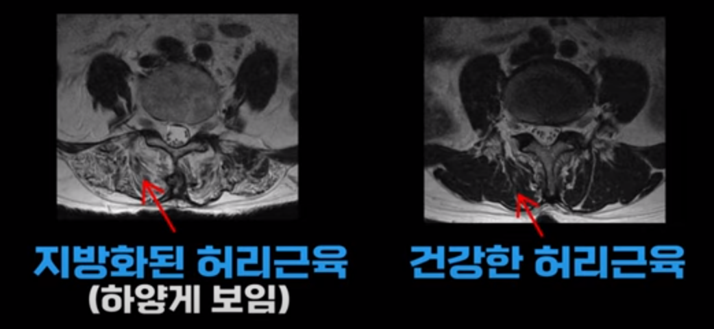 여기 MRI 영상을 보시면 오른쪽은 건강한 사람의 영상이고, 왼쪽은 환자분의 영상입니다. 비교해보시면 이 허리를 펴주는 근육의 색깔이 완전히 다른데, 환자분 경우 허리를 펴주는 근육이 거의 다 지방으로 바뀌어서 거의 하얗게 보입니다. 이렇게 허리에 근육이 거의 없는 상태에서 게다가 이 허리 근육이 아프기까지 하니까 힘을 쓰지 못하고 상체를 붙잡아주지 못하기 때문에 허리가 자꾸 앞으로 구부러지고, 허리가 구부러지니까 잘 못 걷게 되는 것입니다.