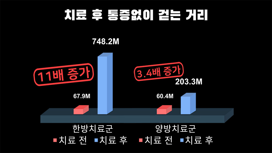 모커리한방병원은 미국 유명 병원과 함께 말기협착증 한방치료 효과를 객관적으로 검증하여 SCI급 국제학술지에 발표하였습니다. 논문의 자세한 내용은 한방치료 후 말기협착증 환자의 통증 없이 걷는 거리가 치료 전에 비해 평균 11배 이상 증가했다는 내용입니다. 이 협착증 논문은 무작위 대조군 연구라는 근거의 신뢰도가 매우 높은 연구로치료 성공 사례만을 모아 발표한 논문들과 비교했을 때 신뢰도에 큰 차이가 있습니다. 그리고 이러한 말기협착증의 한방치료 효과를 세계 최초로신뢰도 높은 무작위 대조군 임상시험을 통해 입증했다는 점에서 큰 의미가 있습니다.이 뿐 아니라국책연구기관인 한국한의학연구원이 연구에 참여함으로써 데이터의 객관적인 모니터링이 이루어졌기 때문에 더욱 신뢰도가 높습니다.