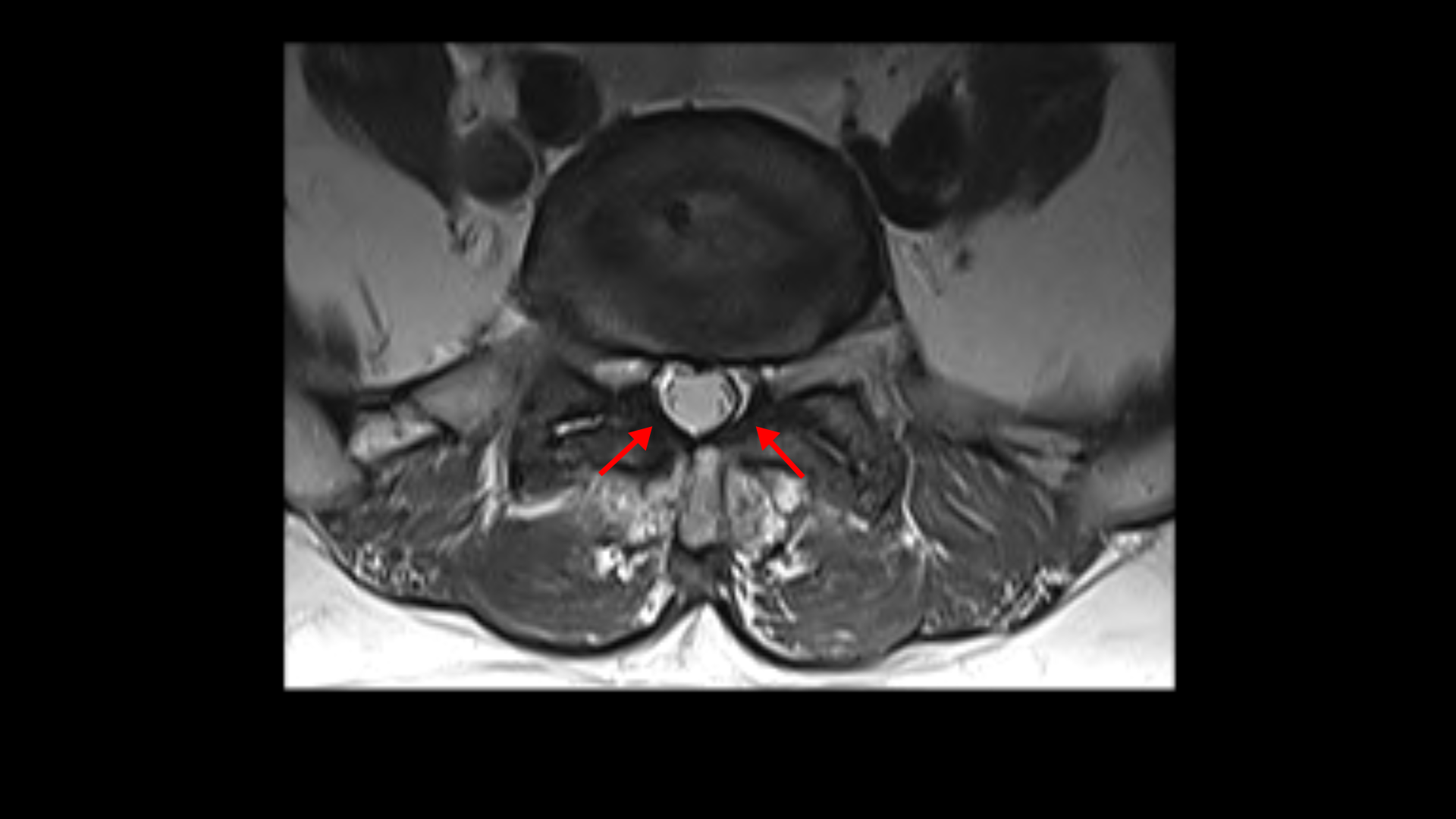 먼저 5번 1번에 척추관 내의 황색인대의 골화 현상이 보이고