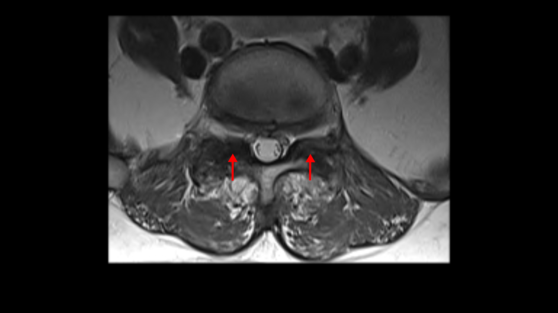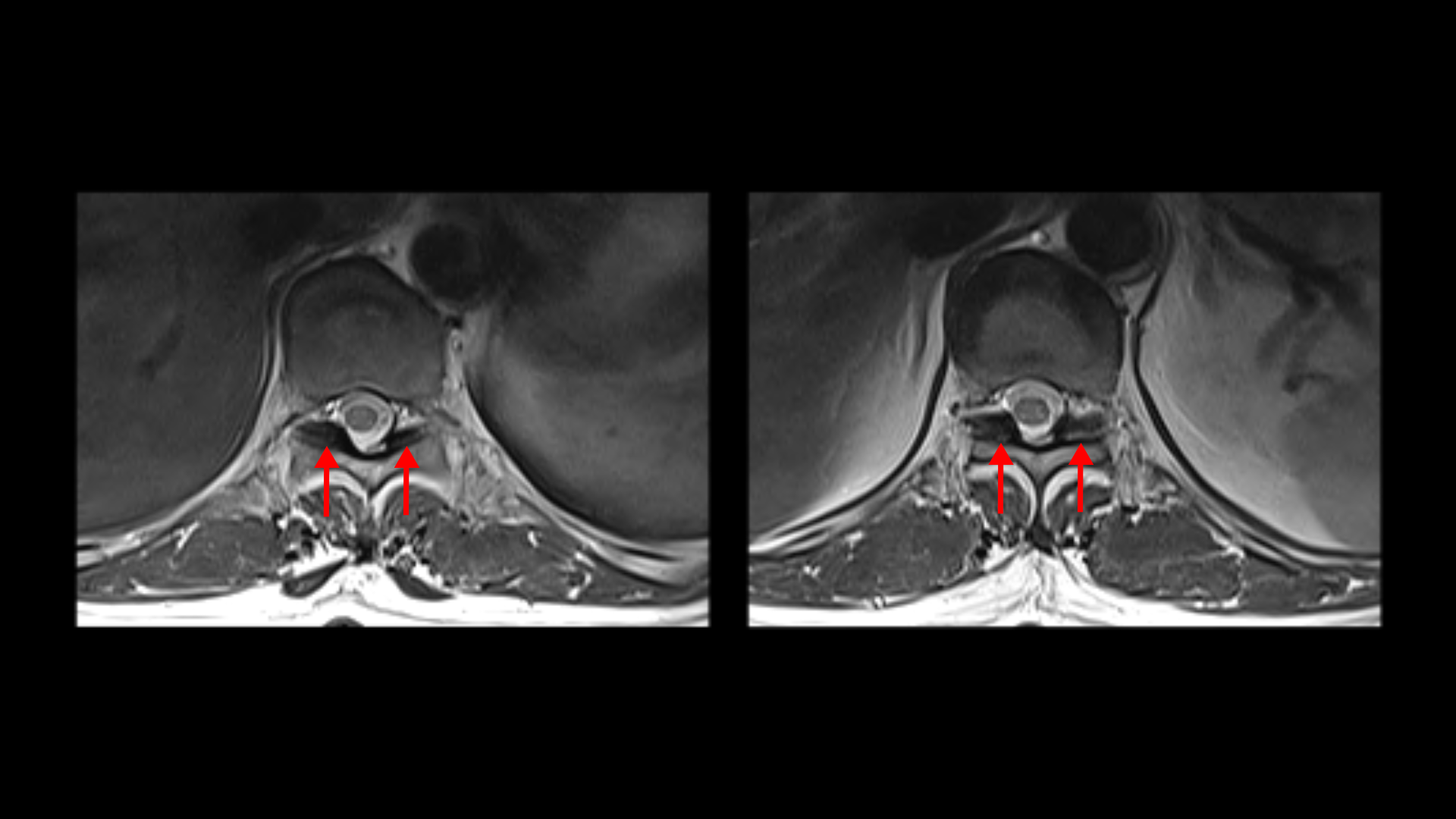 또 흉추 두 마디에서도 역시 황색인대의 골화 현상이 보입니다.