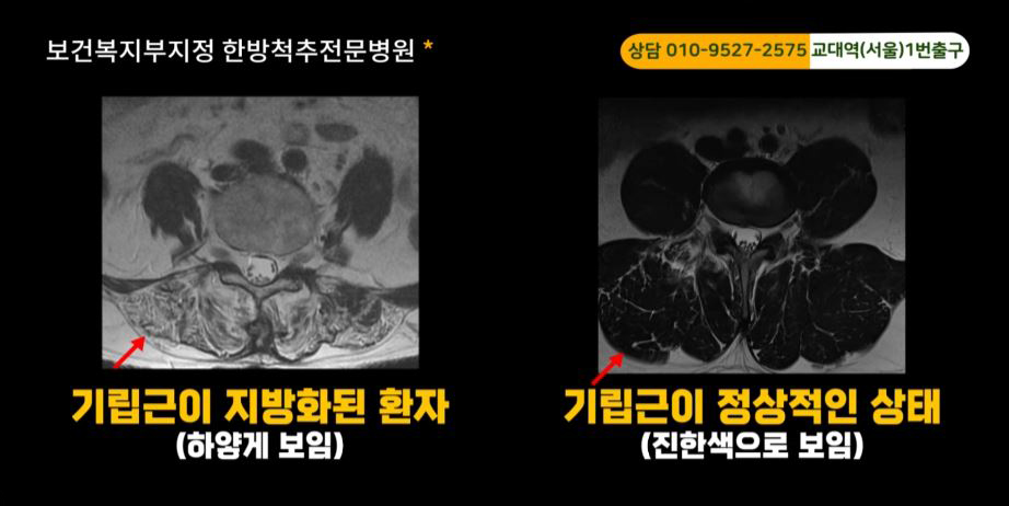 위 MRI에서 보이는 것처럼 기립근이 이미 심하게 지방화된 분들은 보통 일어서기만 하면 허리가 구부러지는 분들이 많기 때문에 과연 수술 후에 이분들의 근육이 그 수술을 버틸 수 있는지에 대해서 신중하게 판단해야 됩니다. 그리고 이런 분들의 허리나 다리통증이 허리에서 신경이 눌려서 아픈 건지 근육 때문에 아픈 건지를 봐야 합니다.