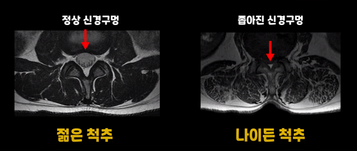 나이가 들면서 척추가 노화와 퇴행에 여기 신경 구멍이 좁아지는 걸 협착이라고 하는데, 그래서 협착증은 대부분 60대 이후에 발병합니다.