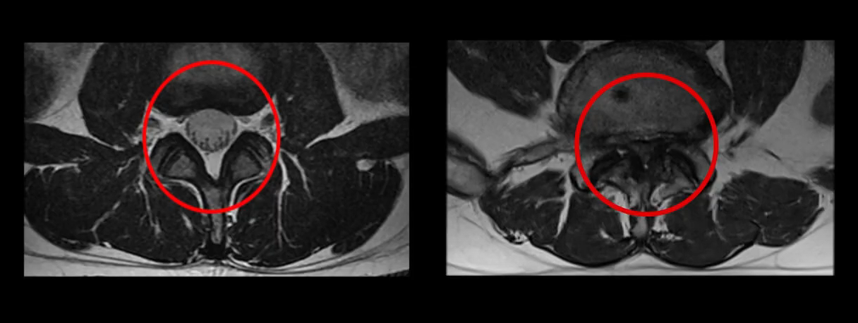 여기 MRI 화면을 보고 설명 드리겠습니다. 척추관협착증 환자의 MRI입니다. 척추를 이렇게 잘라서 보는 겁니다. 왼쪽의 정상적인 척추관에 비해 오른쪽의 협착이 있는 척추관은 척추뼈, 척추후관절, 인대, 디스크 등 척추구조물들의 퇴행성 변화로 인해 척추 신경다발이 지나가는 통로인 척추관이 좁아지면서 신경다발이 전체적으로 눌려 있는 모습입니다.