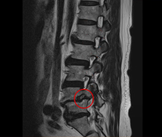 실제 저희 병원에서 추간공협착증 재활치료를 받은 환자분들의 두 가지 사례를 설명 드리겠습니다. 이분들은 심한 추간공 협착으로 인해 한쪽 다리의 심한 증상이 있었고 걷기 어려운 상태였습니다. 첫 번째 환자분은 69세로 전방전위증으로 인한 추간공협착증이 아주 심하게 발생한 분입니다. 여기 MRI를 보시면 심한 협착으로 인해 신경근이 눌려서 한쪽 다리에 마비가 오고 거의 걷지 못하는 상태가 되어 대학병원에서 유합술을 권유 받으셨습니다.