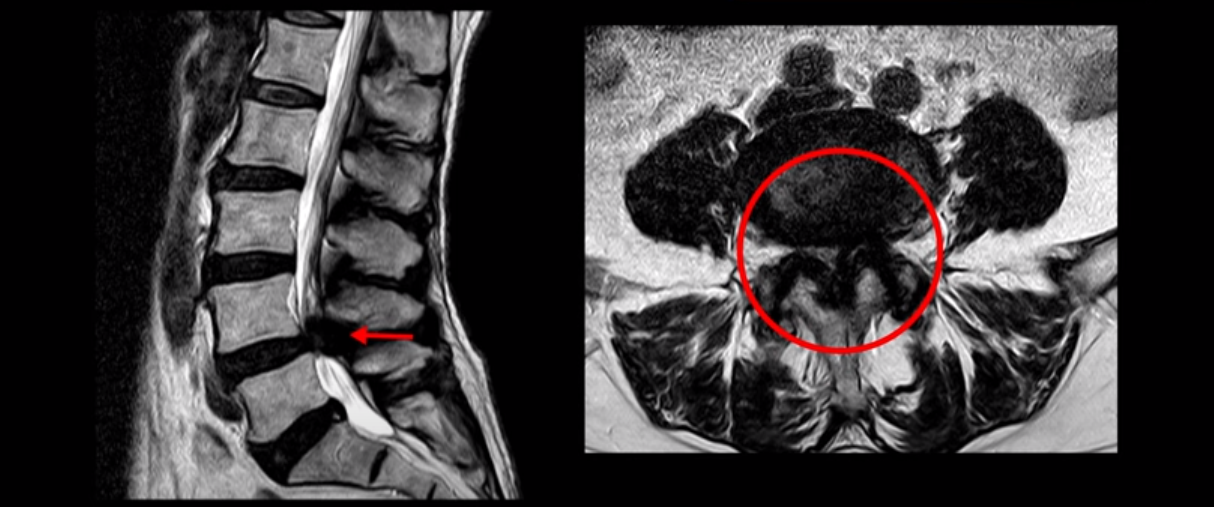 아예 신경이 보이지 않을 정도입니다. 그런데 이분은 이렇게 협착이 심해 보여도 작년 가을까지 아무런 증상이 없었습니다. 협착증의 시작은 가을에 해외여행을 가서 장시간 차량을 타고 이동한 이후 극심한 다리통증과 저림 증상이 발생했습니다. 해외여행으로 허리에 무리가 된 후 허리 근육에 문제가 생기니까 신경 눌림 증상이 시작된 겁니다. MRI로 협착이 심해 신경이 눌려 보이지만 그동안 아무런 증상 없이 잘 살았다는 말은 근육신경재활치료로 근육의 상태를 개선해주면 다시 안 아팠던 상태로 돌아갈 수 있다는 얘기입니다.